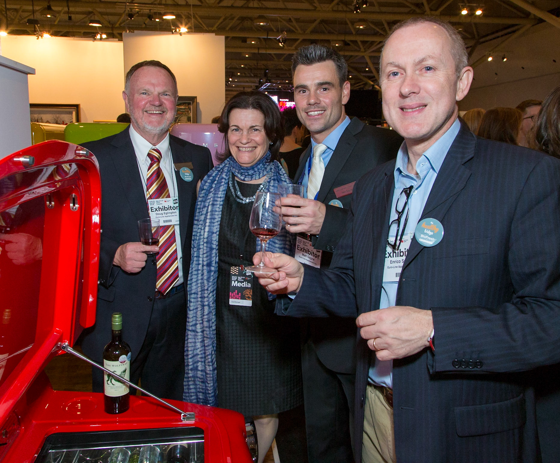 (Booth shots were commissioned by the exhibitors; the party pictures and text were published in the Scene section of Canadian Interiors.) At the Metro Toronto Convention Centre, 5,700 design mavens enjoyed live bands, drinks, snacks and a first look at exhibits at the opening-night party for the 17th annual installment of the Interior Design Show. CUTLINES: Godi Bathrooms; Victoria+Albert; Smed white goods at the Euro-Line Appliances booth; Le Pattern; and Dala Décor. At Godi, the luxury bathroom fixture supplier: Homes Publishing Group’s Jessica MacInnis; Samantha Sannella, booth designer and owner, Urban Retreat Homes; Cindy Grenke of Cing Studio, where she creates custom art objects; Marta Finkel, York University nursing student; Godi’s Eugene Leiderman, sales and marketing specialist; Godi president Dmitry Zherinov; and Homes Publishing Group’s publisher Michael Rosset. At the Elizabeth Interiors/Toronto Home booth: Elizabeth Law, owner, Elizabeth Interiors; Jennifer Mula, operations manager, Toronto Home; fashion commentator and Globe and Mail style columnist Jeanne Beker; Anjha Prostran, designer, Elizabeth Interiors; Leah Dagher, publisher’s assistant, Toronto Home; Cindy Dailey-Morin, business manager, Elizabeth Interiors. At Victoria+Albert: Suzy Louw, sales consultant; Nicola Dankovich, assistant sales consultant; Jonathan Carter, marketing director; Janine Keeble, business development, all from Victoria+Albert; and Eric Eagleton, sales growth manager, Watermarks Kitchen & Bath Boutique. At Le Pattern: Le Pattern’s Elena Slepneva, co-owner and Dimitri Rezvan, sales manager; Maxim Grigorovich, general manager, Fortune Custom Cabinets; and Le Pattern’s John Zheddybin, customer service manager and Sasha Muravyeva, co-owner. At Dala Décor: Randy Phipps, publicist, Evolution PR; Dala Decor’s Priya Ami, business development; Seema and Deep Gill, owners (and spouses); and Meg Peth, president, Evolution PR. At Roche Bobois: Interior designers Nina Bazian, owner of NB designs, and Allan Guinan, partner at Figure3; Lisa Schneider, account rep at furniture supplier Plan B; and Gillian Gillies and Cyndie Jerome of their eponymous interior design firms. At Euro-Line Appliances: company president Douglas Eglington; Caroline McDougall, VP, Homefront magazine, Matt Gagne, Euro-Line area sales manager; and Enrico Sasso, North America sales manager at appliance maker Teka. At patio-furniture maker Hauser’s house. Standing: shop.ca’s George Adamidis, VP customer relations management, and Nick Crain, partner, business development; and booth designer Drew Hauser, principal, McCallum Sather Architects. Seated: Tanya Rentzos, market rep, Cambria; and Hauser’s Holly Hauser (Drew’s brother), retail operations, and Jay Hauser (Holly’s cousin), GTA contract salesman. At Avani Kitchens: Paul Kruger, senior industrial designer, Teknion; architect Justin Ford of Hariri Pontarini Architects, the booth designers; Coraline Allard and Pierre Quesnel, partners in Q and A Design Lab, who built the driftwood cloud overhead; Radha Chaddah, multimedia artist; and her husband, Dave Marcus, president, AyA and Avani Kitchens. At the Designjunction wall: Alex O’Brien, director of first impressions, Veritas Communications; Joshua Nelson, principal designer at commercial designers JNKM Design Group; and Peter Kattan, furniture designer and decorator. Up against the green wall at Miele, who once again boasted the show’s biggest booth: Breanna Armstrong, product trainer, BC; Gina Garaventa, product marketing and marketing communications manager; brand ambassadors Mads Pilested and Sarah Nanacsik; and national training manager Kirby Dumont.