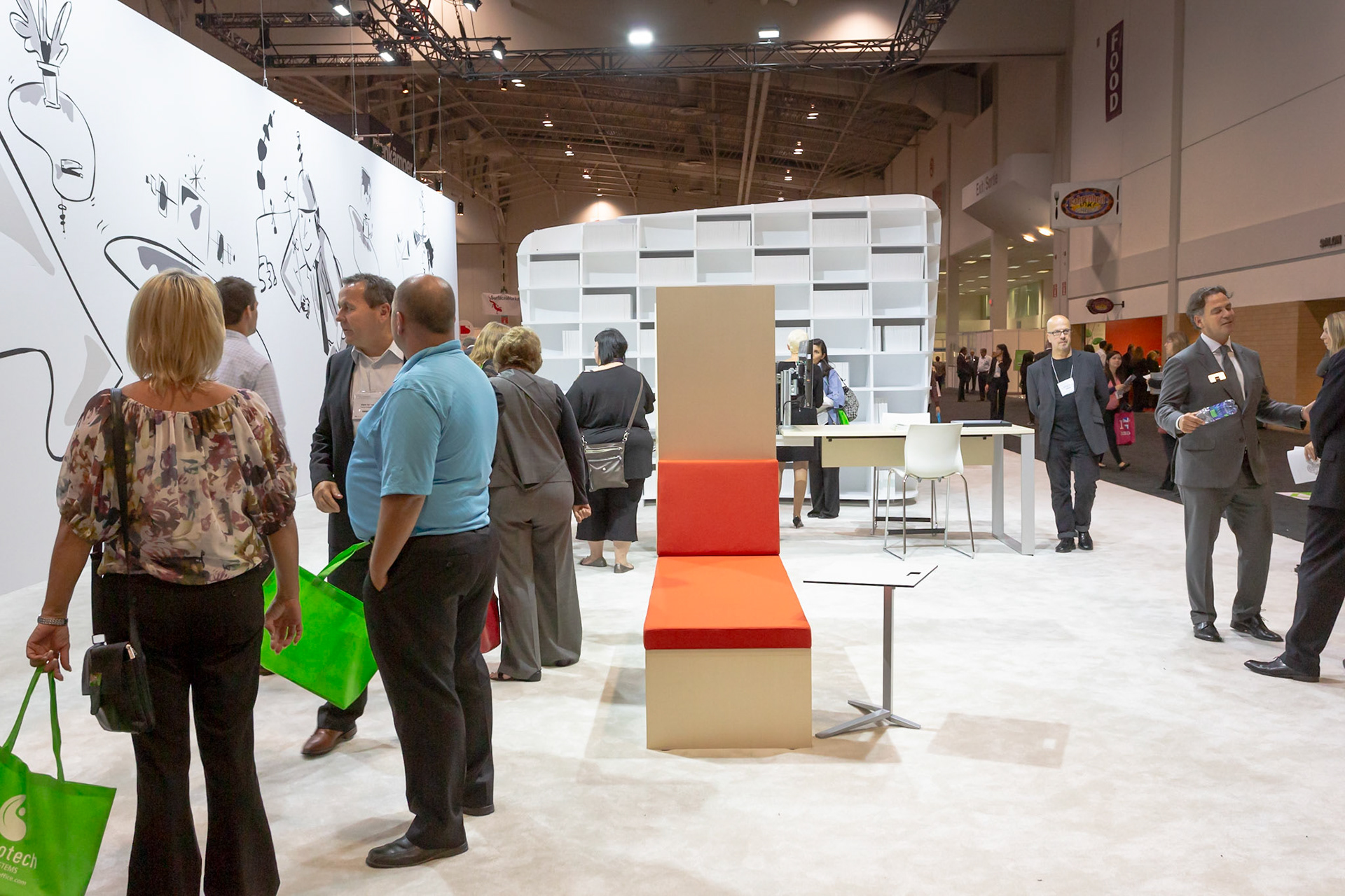 (These images and an accompanying feature story appeared in Officeinsight. The Herman Miller Collection images were commissioned by Herman Miller. ) Year after year, IIDEX Canada, Canada’s largest design expo and conference, would attract about 350 exhibitors and 15,000 attendees from across Canada and the bordering U.S. States to the Direct Energy Centre at Toronto’s Exhibition Place. This year, on Sep. 20 and 21, the hall seemed more filled with exhibitors and visitors, and the buzz was palpable. This year’s new twist was the joint venture between Interior Designers of Canada (IDC) and Architecture Canada-Royal Architectural Institute of Canada (RAIC), with the interior design and architecture communities collaborating to co-present IIDEX. (IDC will continue to own IIDEX, and Informa Canada will continue to manage it.) Reviewing this year’s statistics, IIDEX VP Tracy Bowie said, “We are happy to report that IIDEX attendance increased for the first time in many years to 15,500. The biggest gain was in interior designers and architects from across Canada, thanks to the new partnership with RAIC. The multi-disciplinary diversification of IIDEX Canada to include all areas of design and attract all design professionals combined with lots of new initiatives at the show. It was a winning approach and a model for future growth.” IIDEX continues to broaden its original mandate as a contract office furniture show and include hospitality, lighting, landscape architecture, textile design and other areas. CUTLINES: Mission Design Booth, a joint effort of nine Quebec design studios. IIDEX registration desk at Direct Energy Centre in Toronto’s Exhibition Place. Direct Energy Centre atrium. Jim Salazar at his Think Material exhibit. He presided over another IIDEX booth, for Libertyville, Illinois-based Salazar Associates, where yet more intriguing sample panels hung from the wall. Jim Salazar at his THINK: Materials exhibit. THINK: Materials, the samples showcase of more than 50 innovative materials from around the world. The booth of Toronto-based Teknion, by San Francisco-based Michael-Vanderbyl; Teknion CEO David Feldberg and Steve Verbeek, Vice-President Design. Toronto industrial design star Tom Deacon, whose many well-known creations include the Tom task chair for Toronto-based Keilhauer. Interior Designers of Canada (IDC) and Royal Architectural Institute of Canada (RAIC) booth. Office-chair hockey.