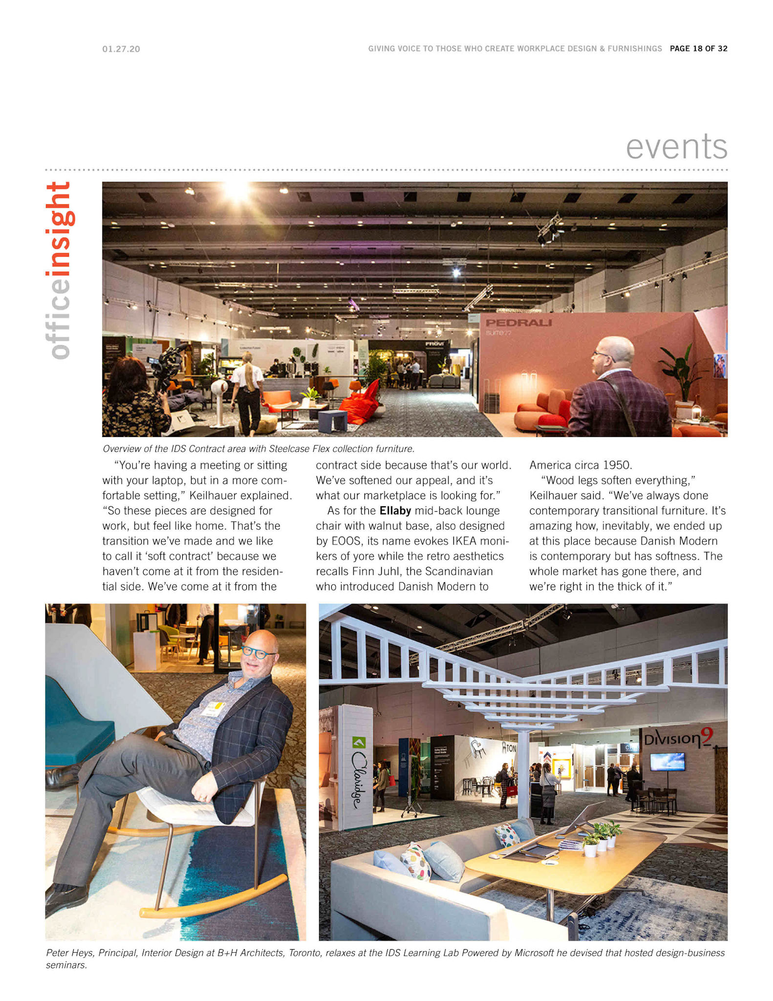 As Canadian correspondent for Officeinsight, the trade journal based in Cedar Hill (Dallas), TX, we provide the photography and text for the annual feature story on the Interior Design Show (IDS). What follows are excerpts from the published story: Canada’s largest design exposition and conference launched the new decade Jan. 16-19 at the Metro Toronto Convention Centre. Previously a retail show, it became a hybrid show last year by absorbing IIDEX, the big show for commercial design, and relaunching it on a smaller footprint as IDS Contract, two trade-only days at IDS aimed at the A&D community. Show owner Informa Markets describes it as “a hyper-curated B2B trade-only exposition and conference focused on all verticals of design including workplace, healthcare, retail, hospitality, education, public spaces, government and more.” CUTLINES:Quartz surface maker Caesarstone’s Dreamland installation by potter, designer and home-furnishings retailer Jonathan Adler used a material associated with straight lines and sharp angles to create clouds, faces and ostrich feathers. Overview of the IDS Contract area with Steelcase Flex collection furniture. Peter Heys, Principal, Interior Design at B+H Architects, Toronto, relaxes at the IDS Learning Lab Powered by Microsoft he devised that hosted design-business seminars. Edible Futures: Food for Tomorrow, a travelling exhibition curated by the Dutch Institute of Food and Design, comprised 13 installations by designers from around the world that riff on sustainable food supply. The Halumm booth showcased eye-catching new products from the German maker of partition walls and office furniture. Nightingale’s Trullo lounge privacy seating. University of Waterloo School of Architecture booth. The show’s most naughtily named booth: BIG (gl)ASS Openings. Polyester felt acoustic baffle cloud at TheQuietRoom.ca. Luke (sales) and Josh (President) Thackray, at acoustic-treatment product maker TheQuietRoom.ca. At IdySpace, the Canadian manufacturer and distributor of custom Corian screens by Los Angeles-based M.R. Walls: IdySpace’s Dan Maher, president and founder, and Steve Kanellakis, managing partner, flank M.R. Walls designer and founder Mario Romano. Keilhauer President Mike Keilhauer in his firm’s Lull chair. The Keilhauer booth featured the firm’s “soft contract” Elevate collection. Corridor in the public area.