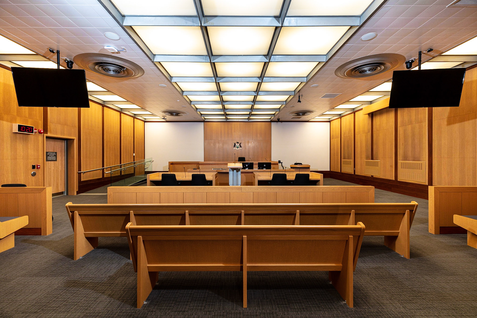 Hamilton, Ontario, POA Courthouse by +VG Architects, published in Canadian Architect. These images were part of the media kit that David Lasker Communications created for our client, +VG. The Canadian Architect feature story was one of our press hits. An iconic midcentury-modern heritage building in Hamilton, Ontario, has undergone an extensive revitalization by +VG that blends elements of the building’s proud heritage with new and modern amenities. Now, renamed Provincial Offences Administration Office, it has returned to its original courthouse function. “There’s a real movement to our cultural appreciation of modernism, the ‘heroic’ design period of the mid-20th century,” says Paul Sapounzi, +VG Managing Partner. “Hamilton has a good stock of these heroic modern buildings.” As architectural photographers in Toronto, we wanted to show how the removal of partitions and acoustic-tile T-bar ceilings installed since the building opened in 1958 exposed hidden treasures. These include a second-storey courtroom’s unusual, handsome fine perforated metal deep trim framing a translucent lighting grid. Another courtroom ceiling is notable for the restored, and now fashionably retro, circular spun-aluminum HVAC diffusers.