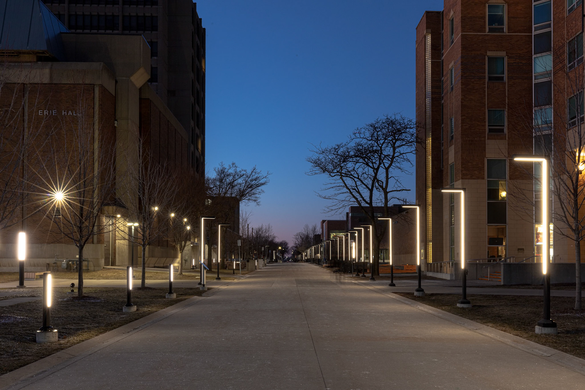 To mark the University of Windsor’s 50th anniversary, the school asked +VG Architects (The Ventin Group Ltd.) to create a campus master plan for the Ontario institution with a vision for the next 50 years. In the first phase of the plan, +VG revamped an anonymous desert of parking lots facing the backs of buildings and their service entrances into an inviting pedestrian realm with hospitable, human-scaled spaces that engender a sense of place and arrival. “We’re transforming the campus into more of a green space by weaving the formerly disconnected open spaces together to make a better, more cohesive campus environment,” says project architect Deb Westman, Senior Associate at +VG’s office in Brantford, Ont. +VG asked us to shoot the new green space’s Welcome Centre Commons and Turtle Island Walk at twilight.