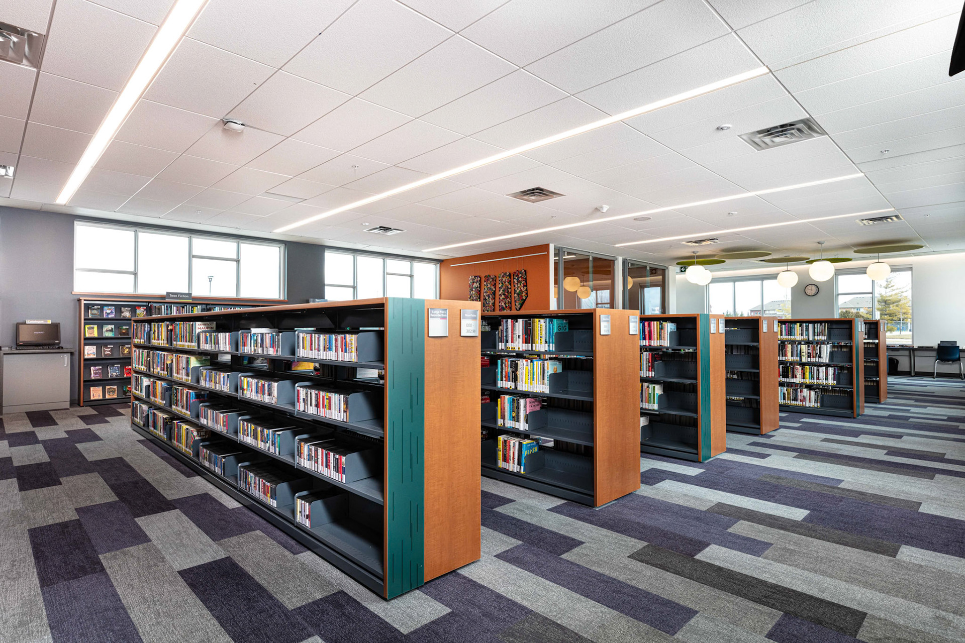 Waterloo Library Eastside Branch On behalf of Shaw Contract’s Ven-Rez Products division, we photographed their bookshelf installations at Ontario’s Hillsburgh Public Library, King City Public Library and, most recently, Waterloo Public Library Eastside Branch.